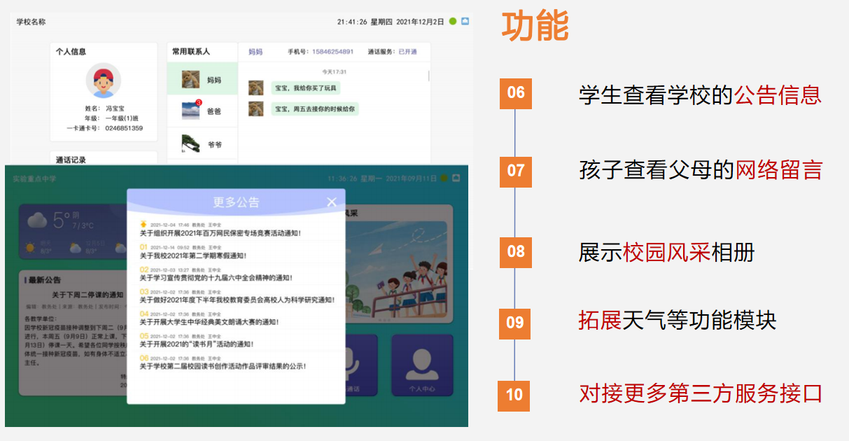 打破學生,教師,家長之間的信息孤島,實現校園數據“采集”,“顯示”“交互”的智能化 。